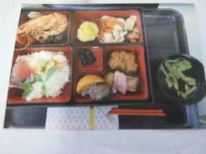 ちらし寿司、田作り、黒豆、数の子、菊花かぶ、鴨肉、たら、豚カツ、焼き魚、栗きんとん、果物、すまし汁
